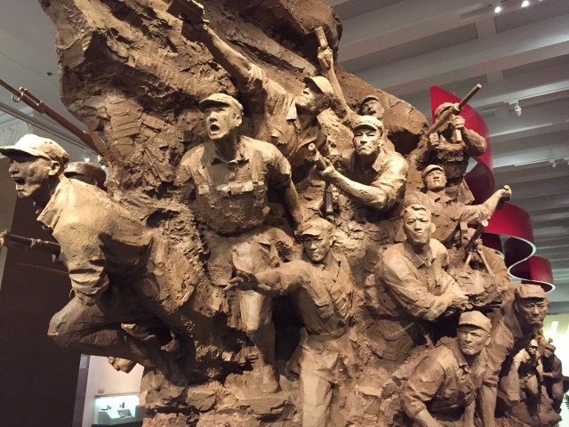 And even though it turned out that I wasn’t technically the only visitor that day, there were fewer than ten of us, so it sure did feel like I had the entire place to myself. This huge, cavernous building was also occupied by about a hundred or so college-aged docents, all of them looking not too thrilled about working on the weekend, and all of them doing their best to duck away from the security cameras when texting on their cell phones. And I couldn’t tell whether they were truly suspicious of me as a foreigner, or whether they were just paying more attention to their guests during the ongoing pandemic, but whatever the reason, I was openly shadowed for the next two hours. I got the distinct impression that this place wasn’t used to receiving too many Westerners at all, especially since the display signs were all written in Chinese. The entire museum– all five floors of it, or six, counting the basement– seemed geared towards inspiring a peculiar sense of nationalism.